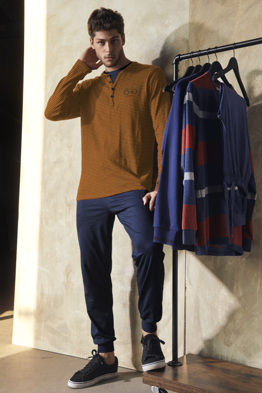 Брюки на манжетах, с карманами. Пояс на резинке с регулируемой кулиской. Джемпер с округлым вырезом горловины и имитацией второго слоя. Декорирован V-образным вырезом на пуговицах. Вышивка в виде велосипеда на груди.