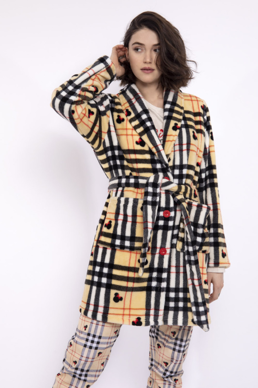 Принтованный флисовый халат на пуговицах, с поясом. Англияйкий отложный воротник. Наклданые передние карманы.