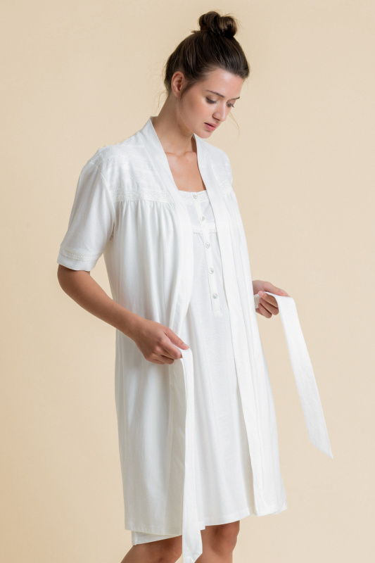 Хлопковый халат на запахе с поясом, декорирован кружевной мережкой