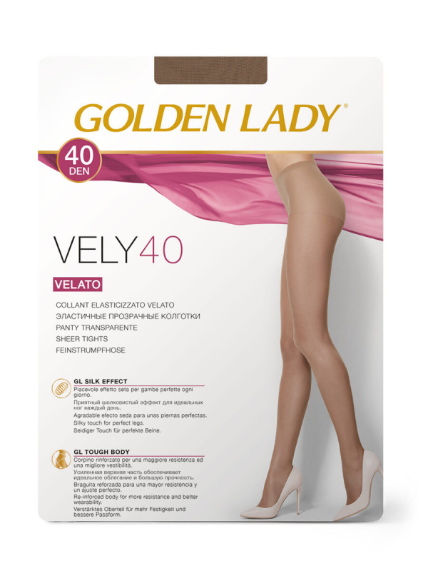 GOLDEN LADY VELY 40 - эластичные средней плотности (40 DEN) колготки на каждый день, серии EVERY DAY. Уже не тонкие, но еще прозрачные, с гладким шелковистым эффектом. Колготки с классической посадкой (на талии). С верхней частью в виде шортиков. Ширина пояса-резинки - 2.5 см. Без ластовицы. С доработанным комфортным круглым соединительным швом. Не формованные. С прозрачным мыском.
