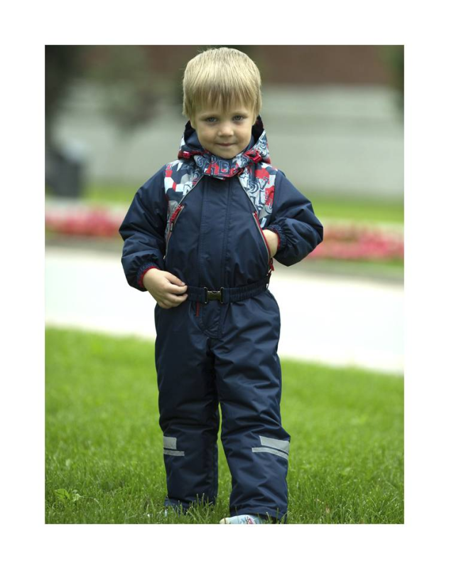 Комбинезон застегивается на молнию. От воротника до низа молнии - ветрозащитная планка, пристегивается на липучки. На груди два кармана на молнии.