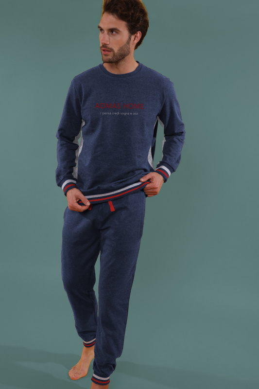 Теплый костюм из меланжевого полотна с начесом. Джемпер с округлым вырезом горловины и бейкой в тон. Декорирован вышивкой Admas Home /pensa credi sogna e osa (думай, верь, мечтай и дерзай) . Рукава с манжетами. По низу пришивная планка-резинка в полоску в тон манжетам на рукавах и брюках. Брюки с карманами, на манжетах в полоску. Пояс на резинке с контрастной красной регулируемой кулиской