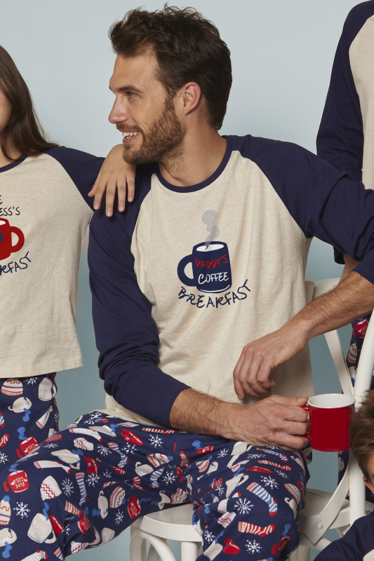 Джемпер с небольшими боковыми разрезами, с округлым вырезом горловины и округлой контрастной бейкой. Рукава-реглан. Декорирован аппликаций Daddy's coffee breakfast. Брюкиc из принтованного хлопка на манжетах, с карманами в шве. Пояс на резинке с регулируемой кулиской