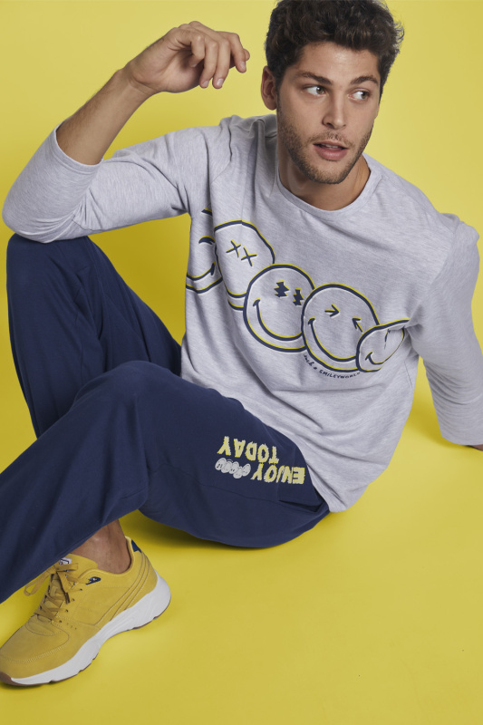 Мужской комплект Smile с начесом. Джемпер с округлым вырезом горловины и бейкой в тон. Декорирован аппликацией со смайлами и надписью sucha smile world. Брюки с манжетами, с боковыми карманами в шве. Пояс на резинке с регулируемой кулиской. Декорированы аппликацией Enjoy today