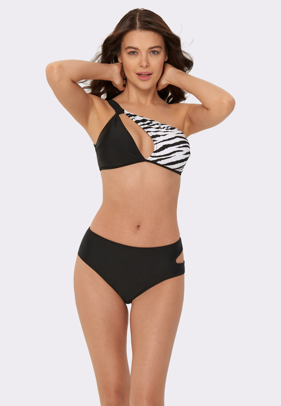 Купальник, в котором не остаться без внимания! Выполнен из приятного телу эластичного материала с актуальным анималистичным принтом. Мягкие чашки без косточек дополнены съёмными формованными вкладышами. Эффектный вырез на груди и асимметричная бретель создают дерзкий образ. Лиф без застёжки. Плавки с высокой посадкой и соблазнительным вырезом дополнены подкладом.