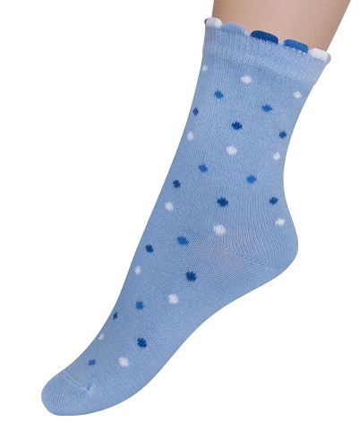 по всему носку вывязаны мелкие двух цветные горошки, борт ПИКОТ разноцветный