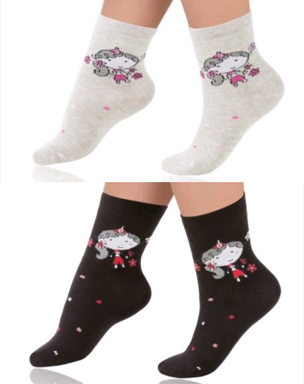 Носки для девочек выполнены в очень красивом и практичном цвете серый меланж с принтом - девочка в розовом платьице. Идеальное решение для повседневной носки благодаря практичному цвету носков и при этом выглядят нескучно.