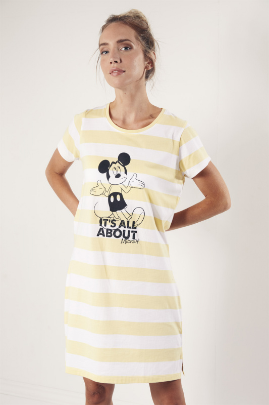 Хлопоковая сорочка свободного силуэта с округлым вырезом горловины с желтой бейкой. Небольшие боковые разрезы. Декорирован принтом.