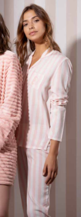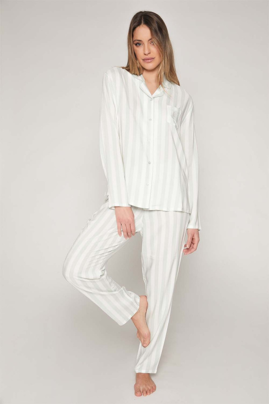 Классическая женская пижама в полоску с рубашкой на пуговицах и брюками с регулируемой резинкой из 100% вискозы. Карман декорирован фирменным логотипом. Упакована в фирменную подарочную коробку.