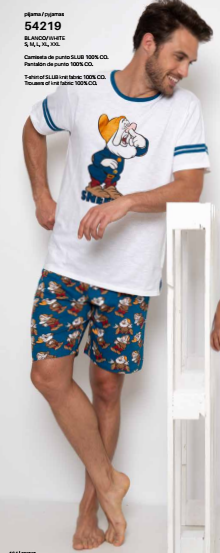 Шорты из принтованного хлопка (принт гномы). Пояс на резинке с регулируемой кулиской. Футболка с округлым вырезом горловины и контрастной синей бейкой. Рукава с лампасами. Небольшие боковые разрезы. Декорирована апликацией с чихающим гномом. На спине уменьшенная апликация с гномом.