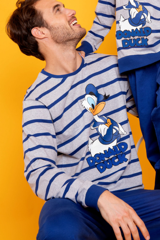 Джемпер с округлым вырезом горловины и синей бейкой. Рукава с манжетами. Вшивная планка-пояс по низу. Декорирован апликацией и махровой надписью Donald Duck. Брюки с манжетами. Пояс на резинке с регулируемой кулиской.