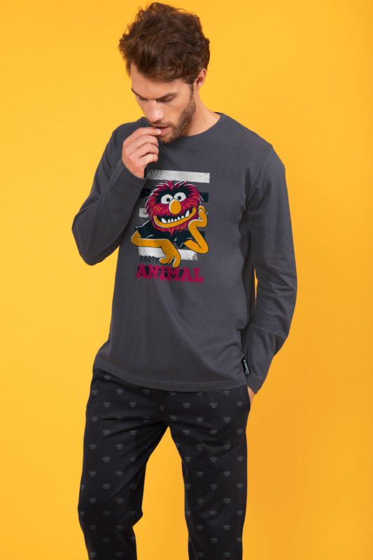 Брюки прямого кроя, из принтованного хлопка (принт мордочки), с карманами. Пояс на резинке с регулируемой кулиской. Джемпер с округлым вырезом горловины и бейкой в тон. Декорирован апликацией.