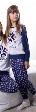 Пижама в скандинавком стиле. Джемпер с округлым вырезом горловины и синей бейкой. Рукав-реглан с манжетами. Резинка-пояс пришивная по низу. Декорирован апликацией из флока в виде снежинок и вышивкой Winter by Admas. Брюки из принтованного хлопка (снежинки) на манжетах. Пояс на резинке с регулируемой кулиской.