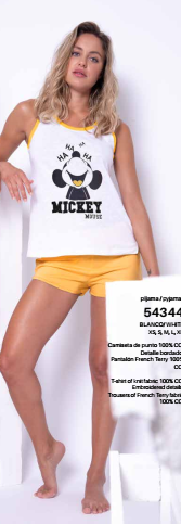 Майка с округлым вырезом горловины. Горловина и проймы рукавов отделаны контрастной желтой бейкой. Декорирова апликацией и вышивкой. На спине небольшая апликация, дублирующая рисунок спереди. Небольшие разрезы по бокам. Шорты из желтого футурированного хлопка с бейкой в тон. Пояс на резинке с регулируемой кулиской.