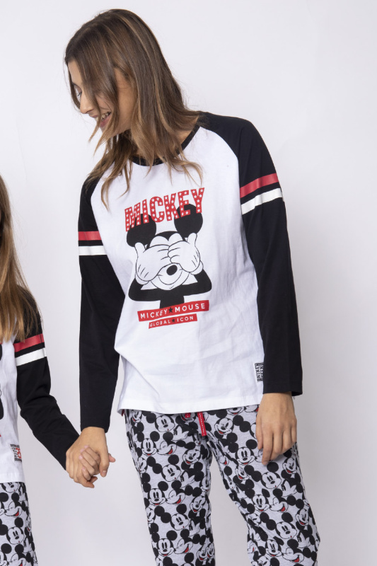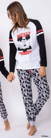 Джемпер с округлым вырезом горловины и контрастной бейкой. Рукав-реглан с аплицированными полосами. Декорирован апликацией с фольгированными элементами. Нашивка на нижнем левом крае. Небольшие боковые разрезы. Брюки из принтованного волокна (принт микки маусы), с манжетами. Пояс на резинке с регулируемой кулиской.