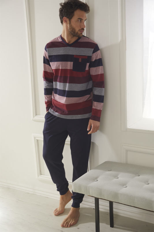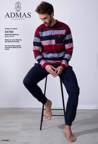 Хлопковые брюки-джоггеры с боковыми карманами в швах и поясом на резинке с регулируемой кулиской. Джемпер с полоску с V-образным вырезом горловины, декорирован нагрудным кармашком с нашитым логотипом Admas.
