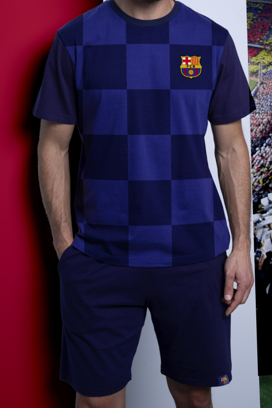 Хлопковый комплект в фирменных цветах футбольного клуба Barcelona. Футболка с округлым вырезом горловины и бейкой в тон, декорирована нашивкой с логотипом клуба. Шорты с карманами, пояс на резинке, декорирован нашивкой с логотипом клуба.