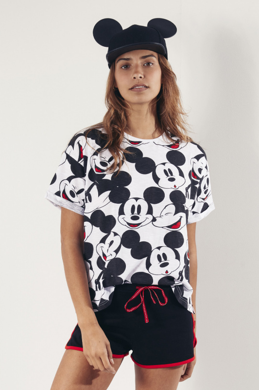Однотонные хлопковые шорты с лампасами и контрастной красной бейкой по проймам. Пояс на резинке с регулируемой кулиской. Принтованная хлопковая футболка с округлым вырезом горловины и белой бейкой-резинкой. Рукава с подкатами. Небольшие боковые разрезы.