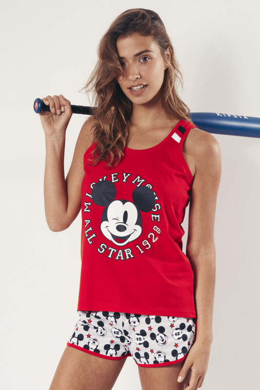 Меланжевые принтованные хлопоковые шорты (принт мордочка микки мауса с красными лампасами и красной бейкой по проймам. Контрастный красный пояс-резинка с регулируемой кулиской. Майка на широких лямках с нашитыми контрасными полосками. Округлый вырез головины и проймы с бейкой в тон. Небольшие бюоковые разрезы. Декорирована спереди апилкацией с глитером и небольшой апликацией сзади на верхней части спинки.