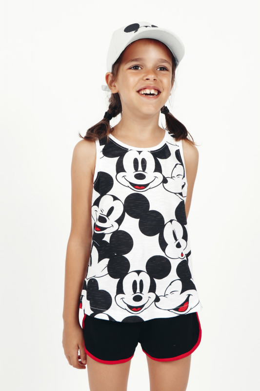 Однотонные хлопоковые шорты с лампасами и контрастной красной бейкой по проймам. Пояс на резинке. Принтованная хлопковая майка на широких лямках. Округлый вырез горловины и проймы с бейкой в тон. Небольшие боковые разрезы.
