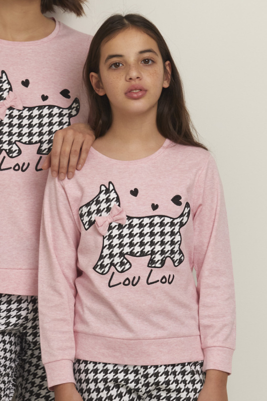 Джемпер из меланжевого хлопка с округлым вырезом горловины и бейкой в тон. Декорирован апликацией с вышивкой (собачка Lou Lou) и пришивным бантиком. Рукава с манжетами. Вшивной пояс-планка. Брюки из принтованного хлопка (геометрический рисунок), на манжетах. Пояс на резинке.