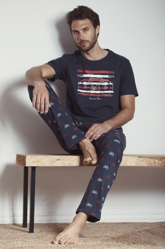 Футболка с округлым вырезом горловины и бейкой в тон. Декорирован апликацией и вышитым велосипедом с надписью Antonio Miro. Брюки из принтованного хлопка (принт велосипеды) с карманами, прямого кроя. Пояс на резинке с регулируемой кулиской.