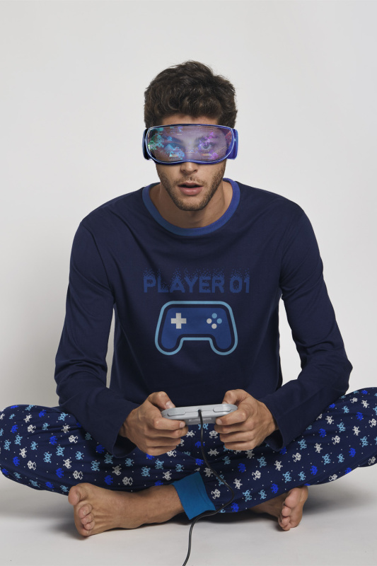 Джемпер с округлым вырезом горловины и контрастной бейкой, декорированный аппликацией в виде игрового джойстика с прорезиненными элементами. Брюки с манжетами. Пояс на резинке с регулируемой кулиской. Боковые карманы в швах.