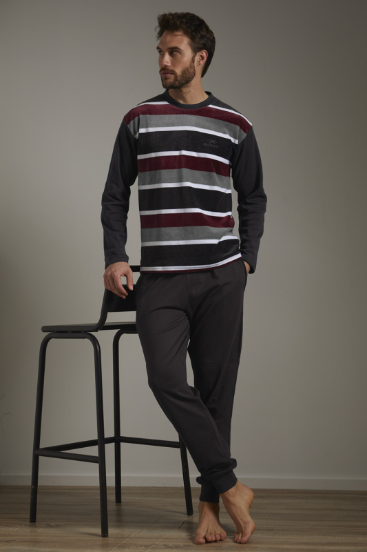 Меланжевые брюки на манжетах, с карманами. Пояс на резинке с регулируемой кулиской. Джемпер из комбинированного полотна: спинка меланжевая, перед велюровый. Округлый вырез горловины с меланжевой бейкой. Декорирован вышивкой на груди - ножницы и надпись Since 2020 Magnific
