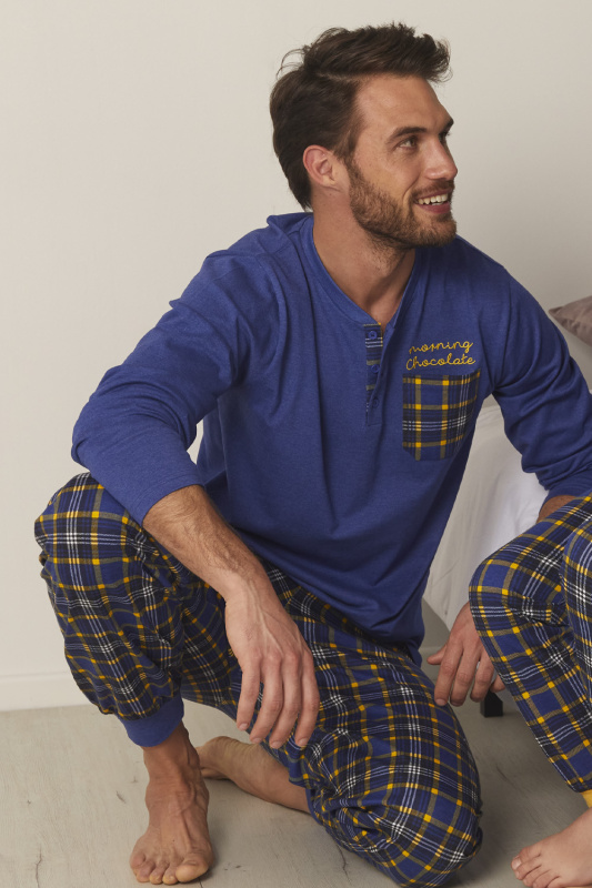 Клетчатые брюки на манжетах, с боковыми карманами в шве. Пояс на резинке с регулируемой кулиской. Меланжевый джемпер с округлым вырезом горловины и планкой с пуговицами.Небольшие разрезы по бокам. декорирован контрастным нагружным кармашком в тон брюк и небольшой вышивкой Morning chocolate.