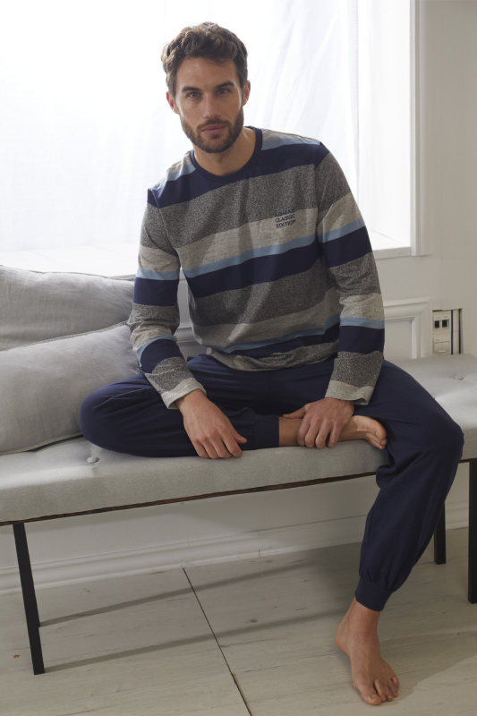 Джемпер с огруглым вырезом горловины и контрастной темно-синей бейкой. Декорирован небольшой прорезиненной надписью на груди Admas Classic Edition. Брюки с манжетами, с карманами. Пояс на резинке с регулируемой кулиской