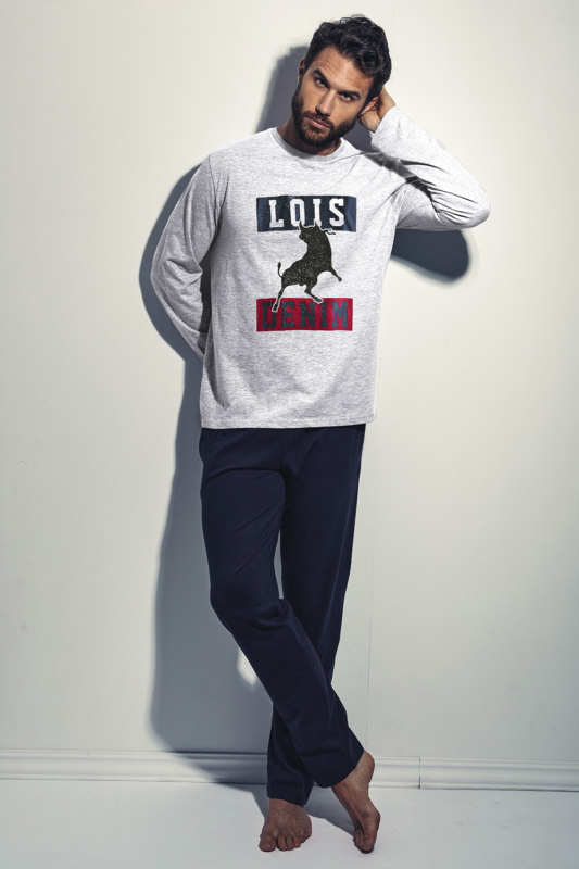 Брюки прямого кроя, с карманами, пояс на резинке с регулируемой кулиской. Меланжевый джемпер с округлым вырезом горловины и бейкой в тон. Декорирован апликацией с фирменным быком lois и нашивкой-логотипом в левом нижнем крае.
