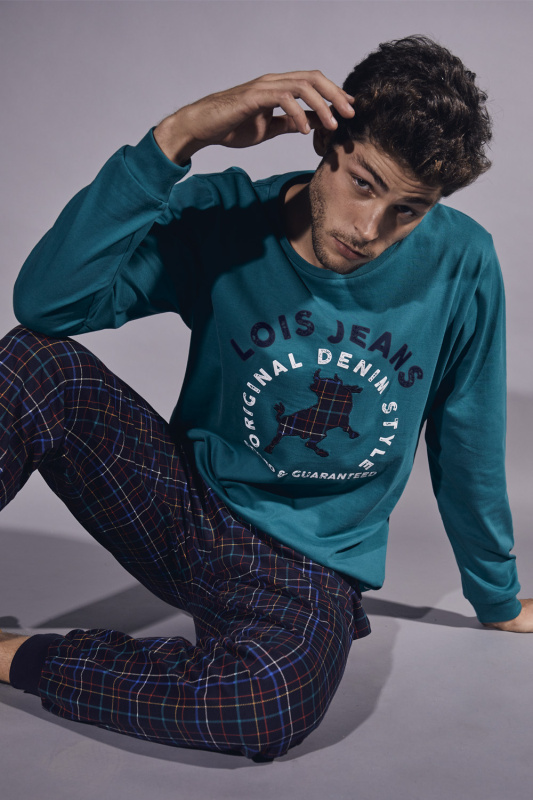 Джемпер с округлым вырезом горловины. Декорирован прорезиненной аппликацией и вышитой нашивкой быка Lois. Небольшой нашивной логотип в нижней левой передней части. Рукава с манжетами. Клетчатые хлопковые брюки-джоггеры, боковые карманы в швах. Пояс на резинке с регулируемой кулиской