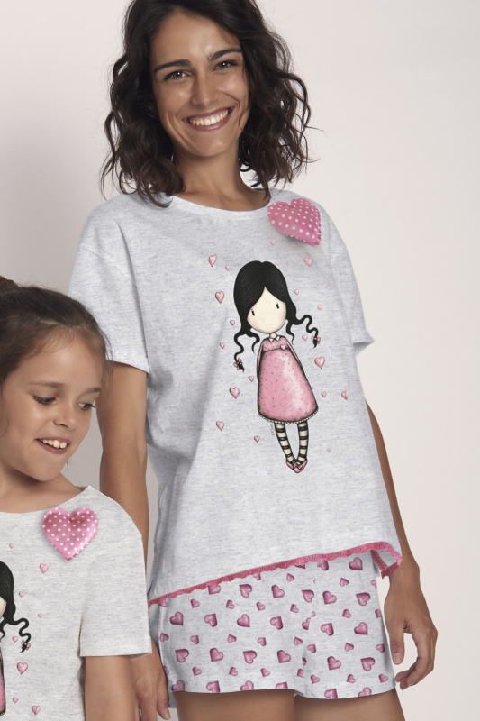 Меланжевые шорты с сердечками. Пояс на резинке с регулируемой кулиской. Меланжевая футболка с округлым вырезом горловины и бейкой в тон. Декорирована кружевом по низу, апликацией с фирменной девочкой santoro, объемным текстильным сердечком. Небольшие боковые разрезы. Небольшой логотип Santoro на спине в зоне лопаток.