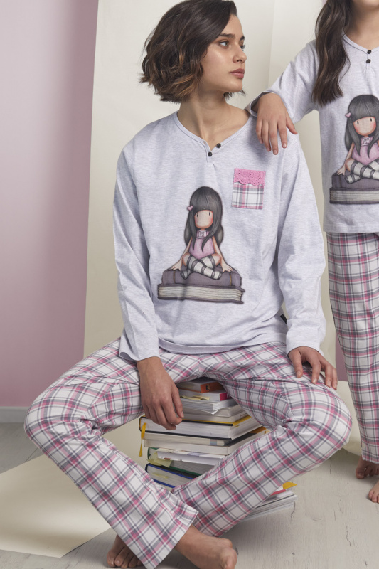 Джемпер с V-образным вырезом горловины на пуговицах. Горловина, рукава и низ с золотым оверлоком. Декорирован принтом. Наклданой нагрудный карман в тон брюк, с накладным полиэфирным кружевом. Небольшие боковые разрезы. Клетчатые брюки прямого кроя. Пояс на резинке с регулируемой кулиской.