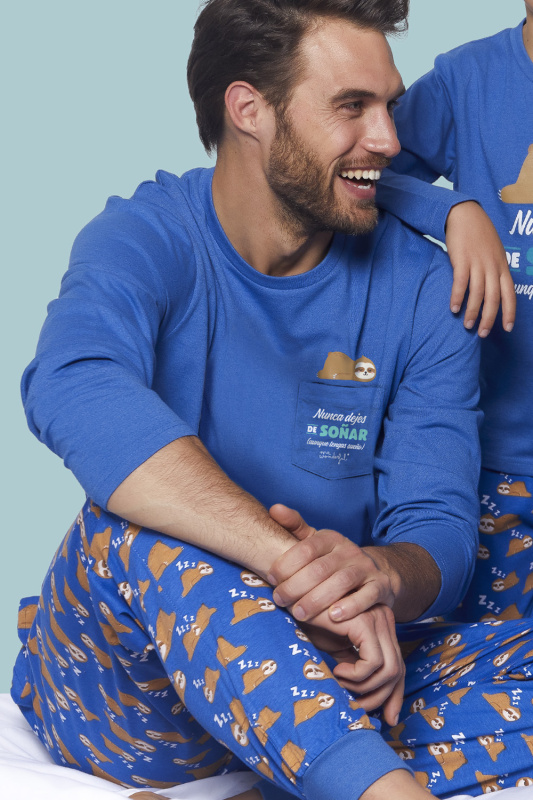 Принтованные брюки-джоггеры (принт спящие ленивцы). Боковые карманы в швах. Пояс на резинке с регулируемой кулиской. Джемпер с округлым вырезом горловины. Декорирован нагрудным кармашком с аппликацией с добавлением флока. Небольшая нашивка-логотив в левой нижней части.
