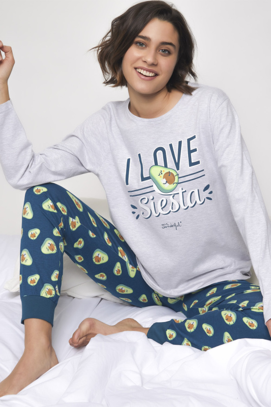 Брюки-джоггеры (принт авокадо) с поясом на резинке с регулируемой кулиской. Меланжевый джемпер с округлым вырезом горловины. Декорирован аппликацией с надписью love siesta и небольшим пришивным логотипом в нижней левой части.