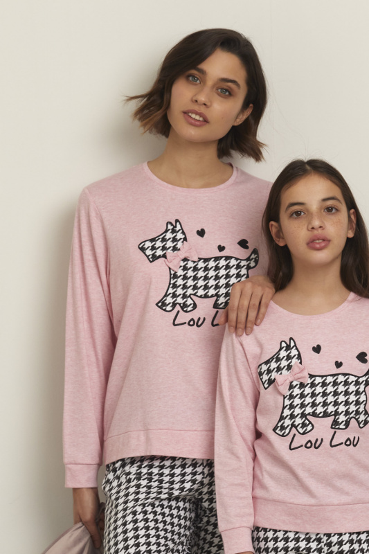 Джемпер из меланжевого хлопка с округлым вырезом горловины и бейкой в тон. Декорирован аппликацией с вышивкой (собачка Lou Lou) и пришивным бантиком. Рукава с манжетами. Вшивной пояс-планка. Брюки из принтованного хлопка (геометрический рисунок), на манжетах. Пояс на резинке с регулируемой кулиской