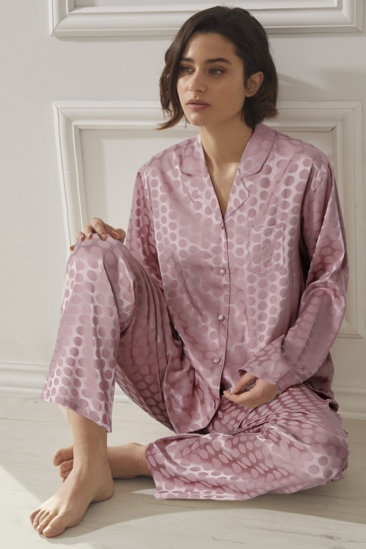 Классическая пижама из искусственно шелка разной фактуры (глянцевая база и матовые горохи). Брюки прямого кроя, пояс на резинке с регулируемой кулиской.Рубашка на пуговицах, отложный воротник. Небольшие боковые разрезы. Нагрудный накладной карман с вышитым логотипом Admas Classic