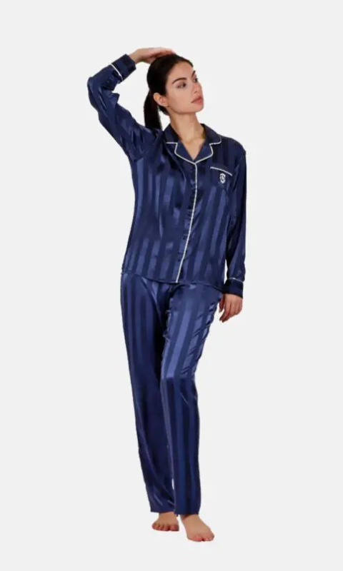 Классическая благородная пижама из искуссвенного шелка в полоску высокого качества. Отложенный воротник на пуговицах. Нагрудный карман декорирован вышитым фирменным логотипом Admas. Рукава с пришивными манжетами. Брюки прямого кроя. Пояс на резинке с регулируемой кулиской.