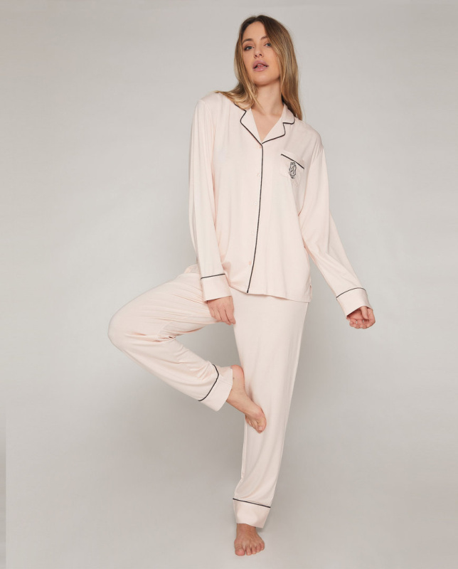 Классическая вискозная пижама на пуговицах. Рубашка с отложным воротником и контрастным кантом. Кант по планке, манжетам и кармашку. Вышитый фирменный логотип на нагрудном кармашке. Брюки прямого кроя с широкими манжетами с кантом. Пояс на резинке с регулируемой кулиской