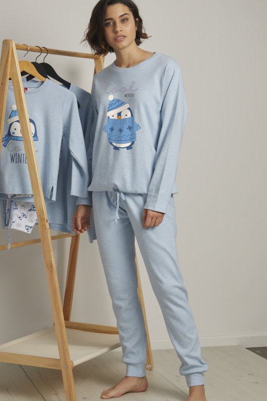 Уютный меланжевый комплект. Джемпер с округлым вырезом горловины и вшивной кулиской по низу. Декорирован вышитой аппликацией в виде пингвина в пушистой шапочке и фольгированной надписью cool winter. Брюки на манжетах, с поясом на резинке с регулируемой кулиской