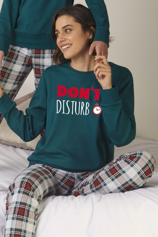 Хлопковый джемпер с округлым вырезом горловины и втачной планкой-поясом. Декорирован аппликацией с вышивкой и махровыми элементами Don't disturb (не беспокоить). Клетчатые хлопковые брюки с контрастными манжетами в тон джемпера. Пояс на резинке с регулируемой кулиской.
