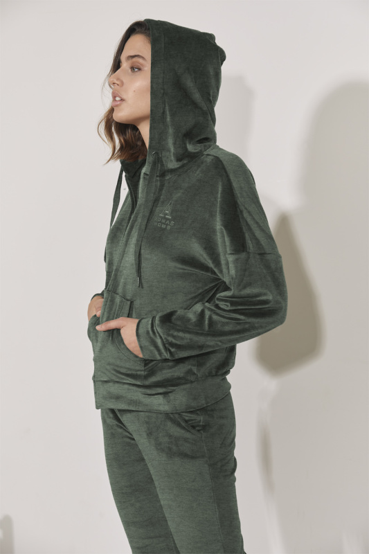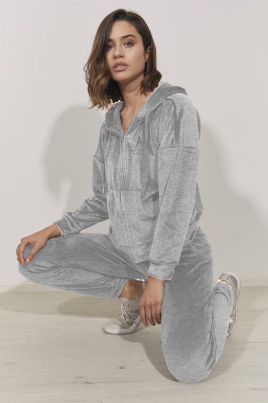 Велюровый костюм. Куртка на молнии, с капюшоном. Прередние карманы с алтасным кантом. Пояс-резинка. Рукава с манжетами. Вышитый логотип Admas Home. Брюки на манжетах, с алтасными лампасами. Пояс на резинке с регулируемой кулиской.