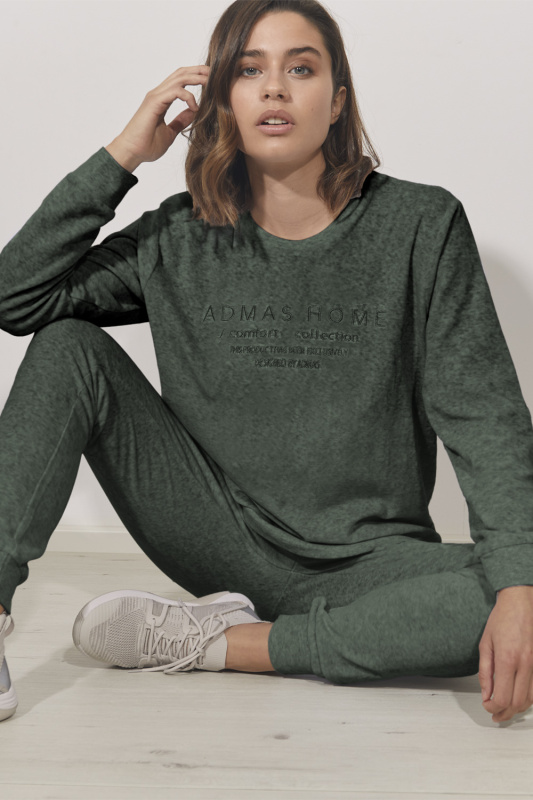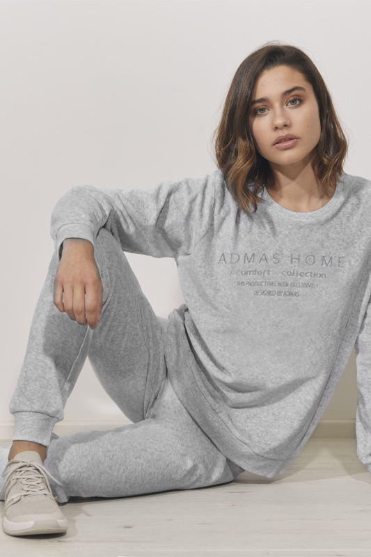 Стильный велюровый комплект, декорированные вышивкой. Брюк на манжетах, с боковыми карманами отделанными атласной лентой. Пояс на резинке с регулируемой кулиской. Джемпер с округлым вырезом горловины, длинные рукава с манжетами декорированы атласной лентой.
