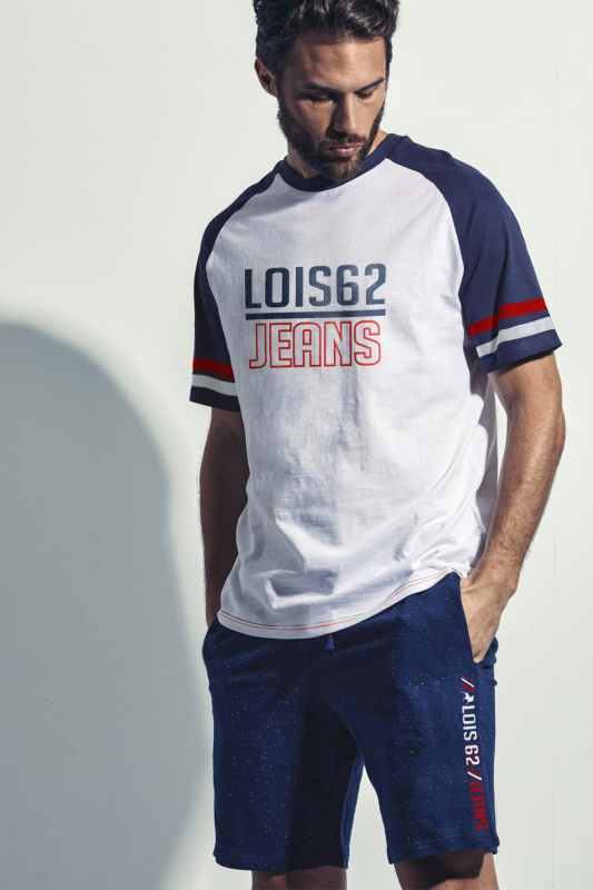 Футболка с округлым вырезом горловины и контрастной синей бейкой. Рукава-реглан с нашитыми полосками. Декорирова прорезиненной надписью. Двойной контрастный шов по низу.