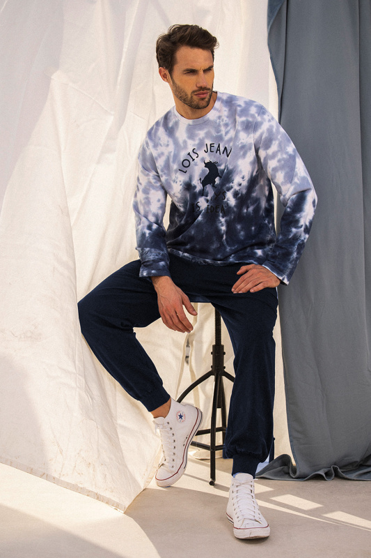 Джемпер из футурированного хлопка размытого акварельного прокраса. Декорирован апликацией. Округлый вырез горловины с бейкой в тон. Брюки с карманами, на манжетах. Пояс на резинке с регулируемой кулиской