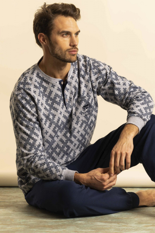 Теплый джемпер с начесом с V-образным вырезом горловины, с планкой на пуговицах. нагрудный накладной карман декорирован вышивкой в виде мотоцикла и надписью Antonio Miro. Рукава на манжетах. Брюки с манжетами. Пояс на резинке с регулируемой кулиской.