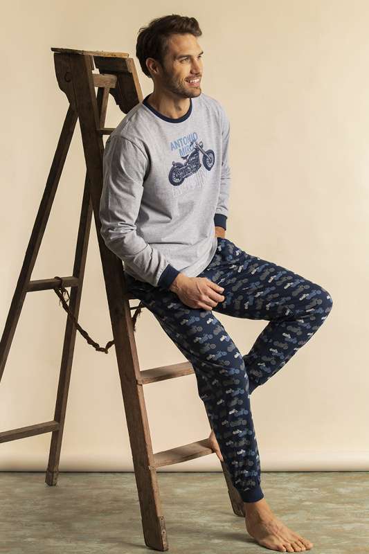 Джемпер с округлым вырезом горловины и контрастной бейкой. рукава с контрастными манжетами. Декорирован надписью из флока и апликацией "мотоцикл". Брюки с карманами, из принтованного хлопка (принт мотоциклы), на манжетах. Пояс на резинке с регулируемой кулиской.