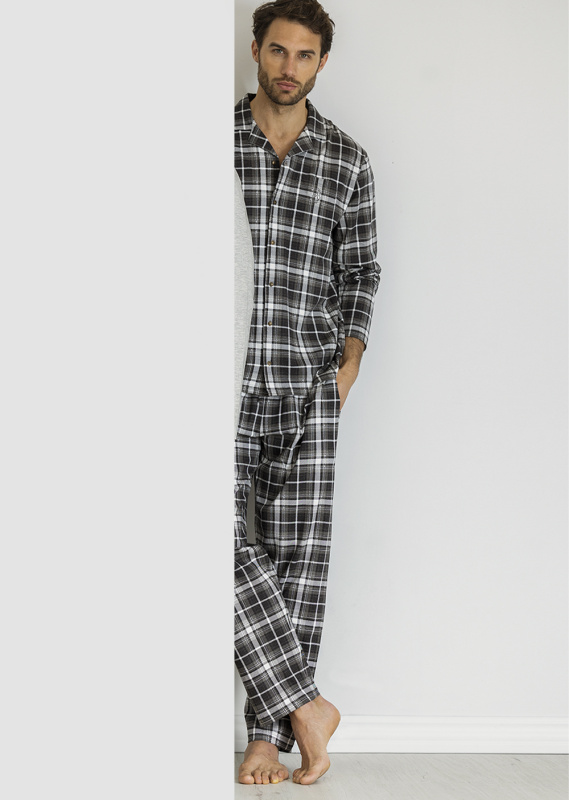 Классическая мужская пижама в клетку. Рубашка на пуговицах с отложным воротником. Наклданой нагрудный карман с вышитым логотипом Admas. Брюки с карманами, прямого кроя. Пояс на резинке с регулируемой кулиской