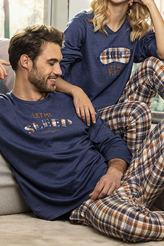 Джемпер с округлым вырезом горловины и бейкой в тон. Декорирован вышивкой let me sleep with you. Небольшие боковые разрезы. Клетчатые брюки с карманами и с манжетами. Пояс на резинке с регулируемой кулиской.